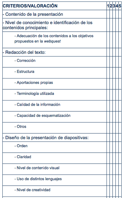 - Webquests: ofrecen una tabla de valoración que aparece en la Ficha del profesor que acompaña al recurso y te servirá para valorar distintos aspectos del trabajo hecho por los alumnos en una escala del 1 (muy mal) al 5 (muy bien). Puedes utilizarla también para la coevaluación.
